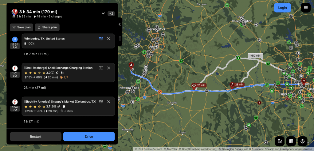 The planned route back was similar but ABRP added in a third stop close to home since I did not want to charge above 90% in Flatonia.